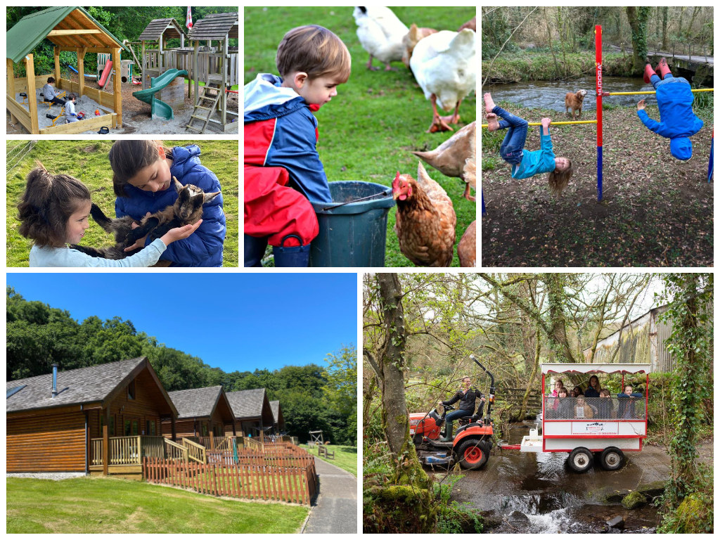 collage of images showing child and family friendly cornwall holidays at coombe mill