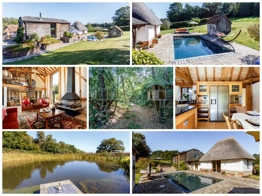 Whiteshoot Farm is a rural thatched barn conversion near the New Forest in Hampshire.  Parent friendly holiday features include spacious living accommodation with four bedrooms, a superb outdoor heated pool, zip wire and lake with rowing boat.