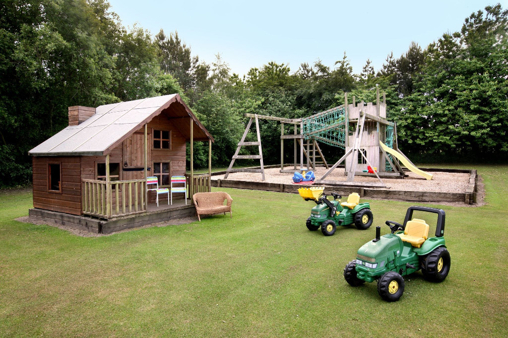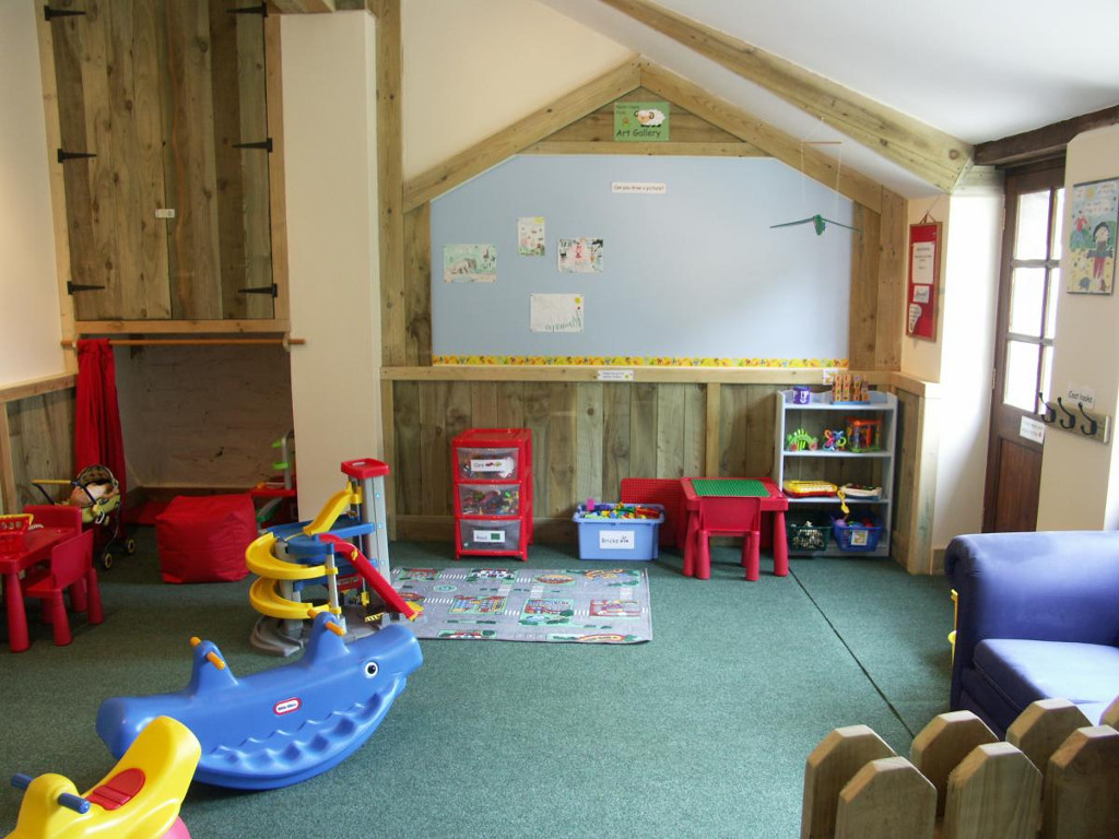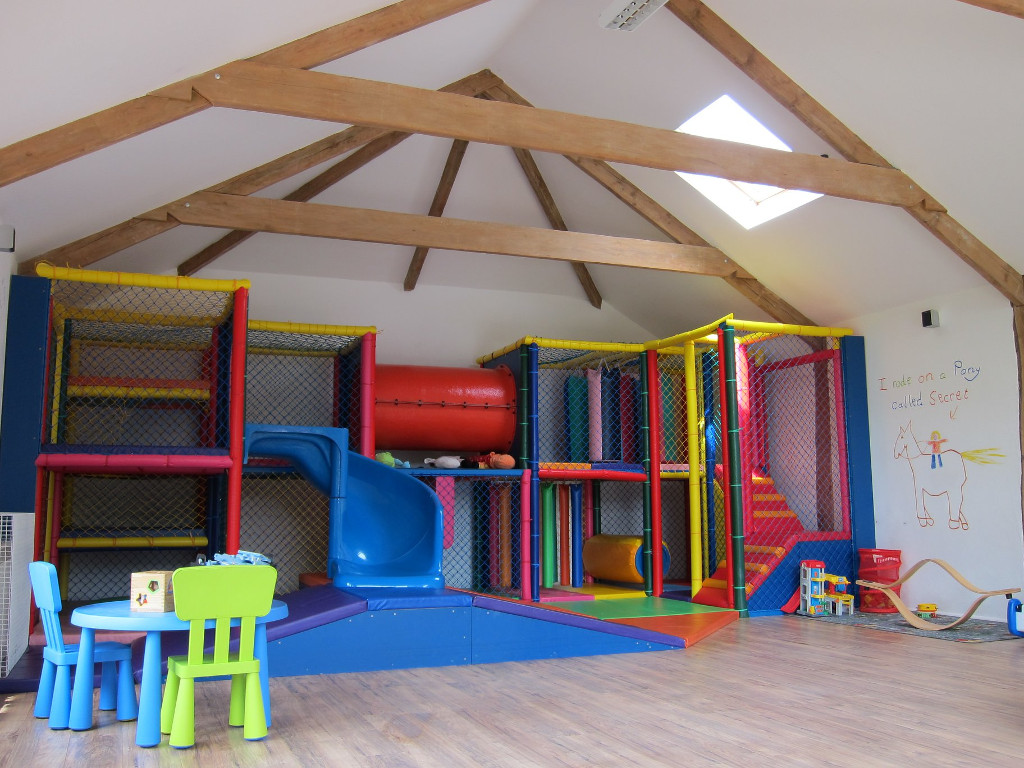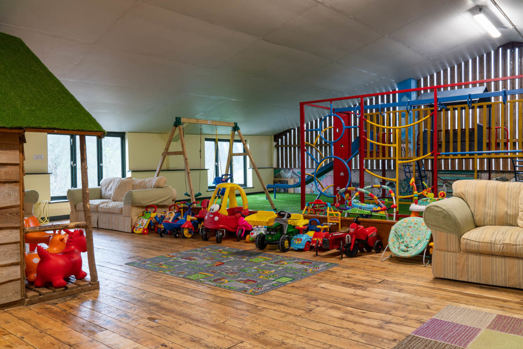 a wonderful indoor playbarn with soft play area, buckets of toys, ride-on cars and trikes, soft-floor playground and two storey wendy house