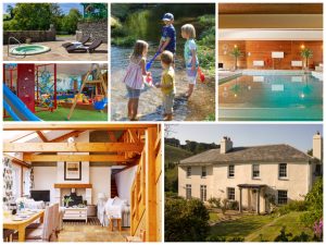 collage of images showing child and family friendly devon holidays at flear farm cottages