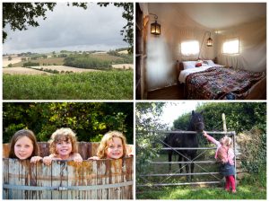 collage of images showing child and family friendly glamping holidays at hollings hill farm near the cotswolds